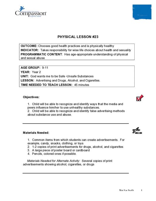 The lesson “Advertising and Drugs, Alcohol and Cigarettes” is part 23 of a 35 part series on human development, the human body, health, and safety. This lesson teaches how outside influences can shape people’s decisions. This resource includes a lesson plan for the teacher on how to prepare beforehand, class-time content to facilitate learning, hands-on activities facilitating further learning, and a teacher assessment at the end. There is also an alternate activity suggested. This lesson is designed for a group of children between the ages of 9 and 11, and is the twenty-third physical development lesson in the Core Curriculum, 9-11 years, Year Two.