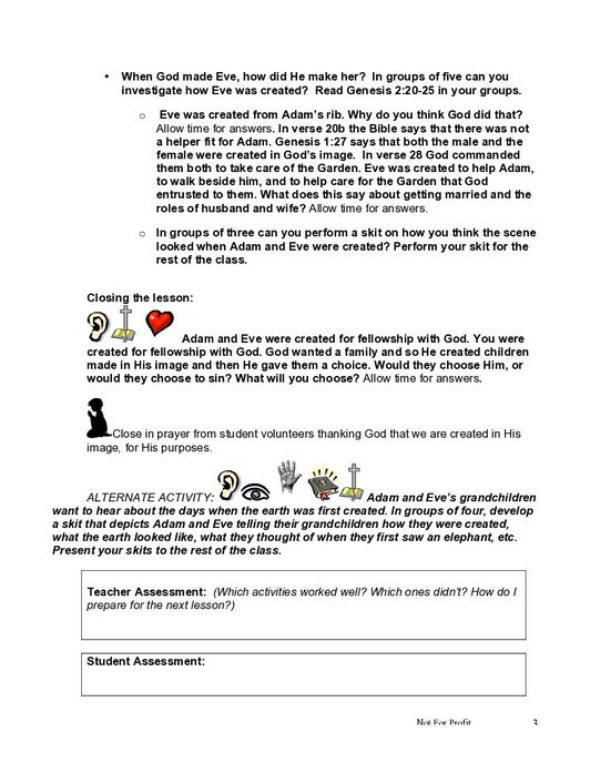 The lesson “He Created Adam and Eve” allows the children to creatively portray the creation of Adam and Eve by retelling the story aloud, through art, or by a dramatization. The children will understand that Adam and Eve were created for the purpose of fellowship with God and that He wants all of us to have fellowship with Him as well. Each child will describe reasons why family is important physically, spiritually, and emotionally. The lesson includes guided instructions for the teacher, including preparation, a script, and suggested activities to facilitate further learning in a fun and interactive manner. This lesson is designed for children between 9-11 years, and is the 14th lesson in the 2nd Year Core Curriculum Set and part of the “God is Creator” unit.